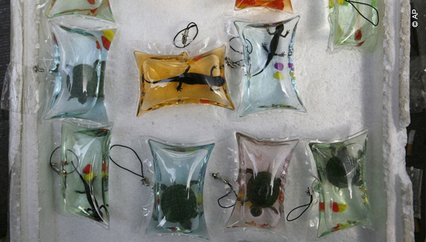 A growing trend in China is key rings made of plastic bags filled with colored, oxygenated water and a small fish, turtle, or other amphibian swimming inside.