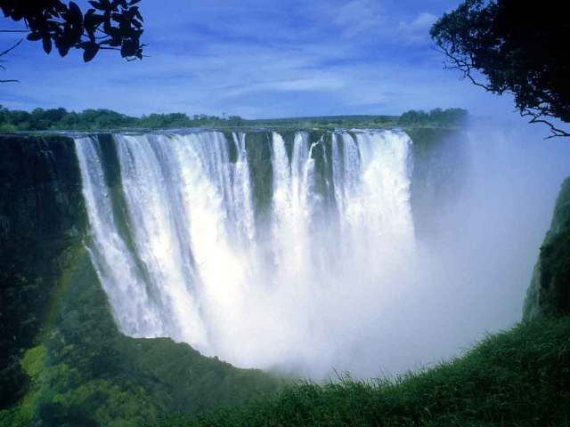 Victoria Falls is a waterfall in southern Africa situated between Zambia and Zimbabwe. The falls are 108 meters high and 1,708 meters wide – the largest curtain of water in the world. The falls drop between 90m and 107m into the Zambezi Gorge, wiht an average of 550,000 cubic metres of water plummeting over the edge every minute.