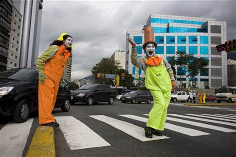 Mimes gesture as they stand in a crosswalk in Caracas, Venezuela. The mayor of the city’s eastern district of Sucre has launched a unique program aimed to encourage civility among reckless drivers and careless pedestrians, putting 120 mimes at intersections to politely and silently scold violators. The campaign kicked off last week as mimes posted at busy intersections mocked people who jaywalked or acted brutish behind the wheel.