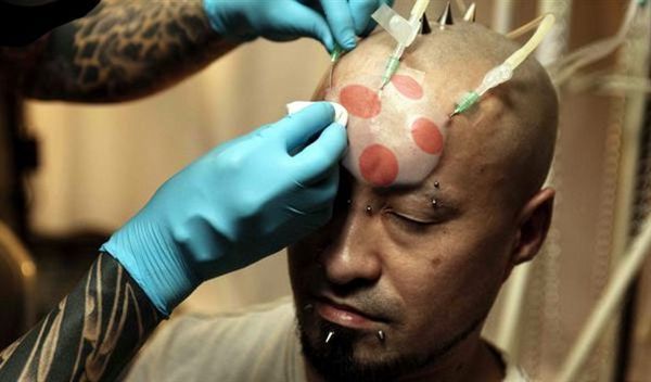 A recent trend in body modification in Japan is implanting objects, such as magnets, in the skin.  Now, instead of an actual object being placed in the skin, a saline solution drip is used to cause inflammation and swelling in various parts of the body.  For many, the result is a large, bagel-shaped “implant” on the forehead.  It’s a temporary modification, lasting only around 24 hours or so before wearing off.  Other individuals are placing the saline in the arms, leading to bizarre, disfigured “muscles.”