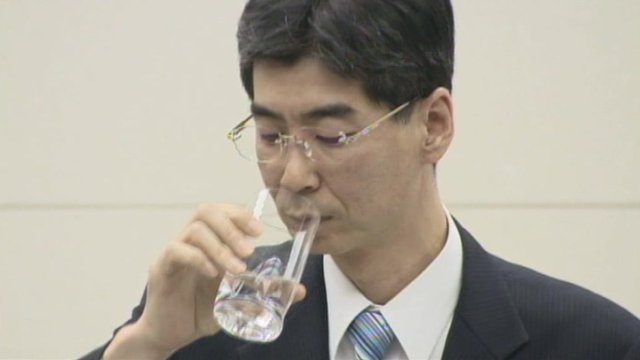 Yasuhiro Sonoda appeared nervous and his hands shook as he downed a glass during a televised news conference.
