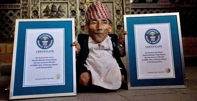 Dangi takes the shortest man record from Junrey Balawing of the Philippines, who is 23.5 inches (60 centimeters) tall. He also beat the record of Gul Mohammed of India as the shortest adult human to have their height verified by Guinness. Mohammed, who died in 1997, was 22.5 inches (57 centimeters) tall.