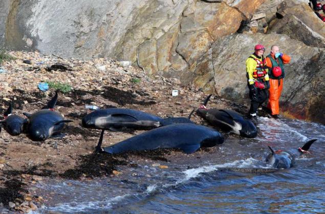 The whales may have become stranded after the lead whale got sick or lost its way, officials told the newspaper.