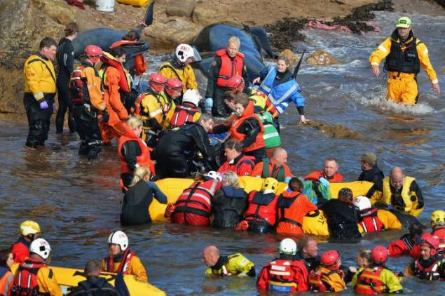 Volunteers, coast guardsmen, firefighters and local vets scrambled to rescue the poor beasts from the shallow North Sea waters.