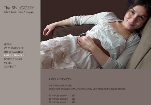 She makes her clients acknowledge that no sex will be involved during the session (sexual arousal is fine), but for $60 anyone can snuggle up with 29-year-old Jackie Samuel for an entire hour.