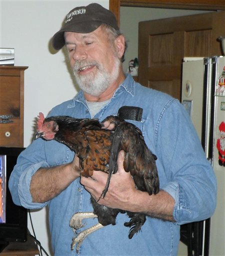 In this photo provided by Barb Murray, Brad Krueger of Alma Center, Wis., holds his neighbors chicken, Cluck Cluck, on Friday, Dec. 28, 2012. The chicken, which the neighbors kept as a pet, is being credited for saving that family from an early-morning fire Thursday by waking the couple with its vocal clucking. (AP Photo/Courtesy Barb Murray)