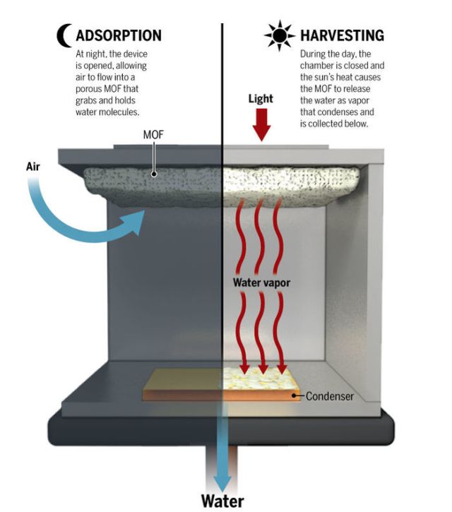The device, which calls to mind the “moisture vaporators” Luke Skywalker oversaw in his youth, was developed in collaboration between chemist Omar Yaghi and mechanical engineer Evelyn Wang. It relies on a special material combining zirconium and adipic acid into what’s known as a metal-organic framework. At night, the material collects water molecules from the air. Then, during the day, sunlight causes it to release the water into a condenser.