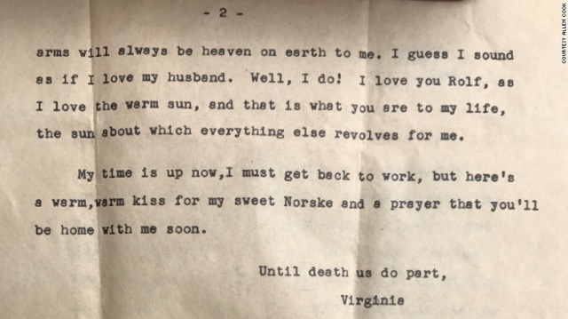 Dated May 4 of that year, the typed letter was written by a woman named Virginia to her husband, Rolf Christoffersen. At the time, he was a sailor in the Norwegian navy.