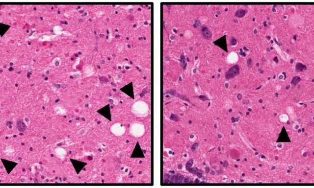 The image shows brain tissue from Alzheimer’s rats that were untreated (left) or treated (right) with the neuroprotective compound. The white “holes” indicated by the arrows are areas of brain cell death, and are more numerous in the untreated rats. Although the treatment protects the animals from neuronal cell death and Alzheimer’s-type symptoms, it does not alter the buildup of amyloid plaques and neurofibrillary tangles in the rat brains. The research from the Iowa Neuroscience Institute at the University of Iowa was published online in the journal Biological Psychiatry. Credit: Pieper Lab, University of Iowa.