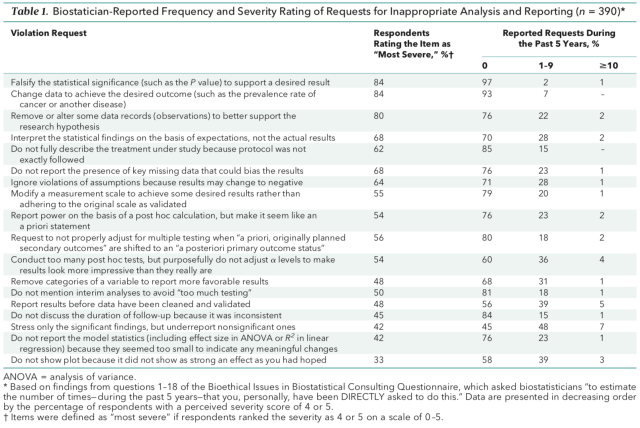 The authors surveyed 522 consulting biostatisticians and received sufficient responses from 390. Then, they constructed a table (shown below) that ranks requests by level of inappropriateness. For instance, at the very top is “falsify the statistical significance to support a desired result,” which is outright fraud. At the bottom is “do not show plot because it did not show as strong an effect as you had hoped,” which is only slightly naughty.