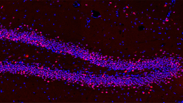 The dentate gyrus of a mouse that received deep brain stimulation, with cell nuclei in blue and expression of the gene c-Fos in red.
