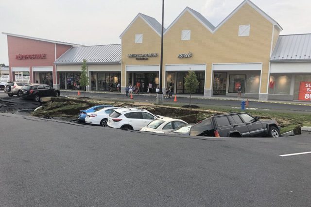 A giant sinkhole swallowed six cars and threatened two more right in the middle of the parking lot. No one was injured.