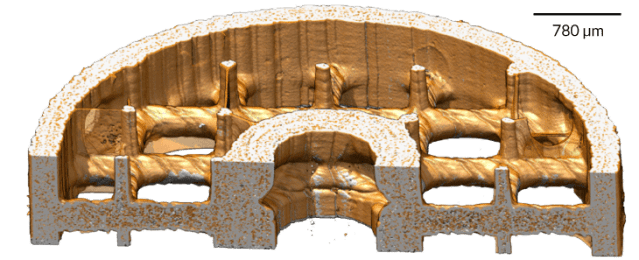 This image shows a cross-sectional view of a new 3-D printed cylindrical device that could cut down on toxic side effects from cancer treatment. Resin coatings (gold) bind to a chemo drug used to treat liver cancer, experiments show.