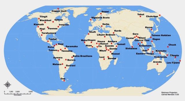 Earlier studies have looked at some of these rules in certain places, Curry and his colleagues note, but none have analyzed all of them across a broad, representative sample of societies. For this new study, they explored a database called the Human Relations Area Files, which includes thousands of ethnographies “from simple hunter-gatherer bands to kingdoms and modern states.” They examined ethnographic views of morality from a stratified random sample of 60 societies around the planet (see map below), comprising more than 600,000 words from more than 600 sources.