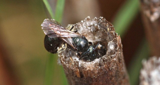 Females of a small bluish-black Mediterranean bee (Ceratina nigrolabiata) dig out the pith of plant stems to make a nest, where a mom lays her eggs. Unlike honeybees, these are solitary bees with no colony of daughter-workers. Without that help, the mom herself must collect nectar and pollen to feed the young. But these are no latchkey larvae.