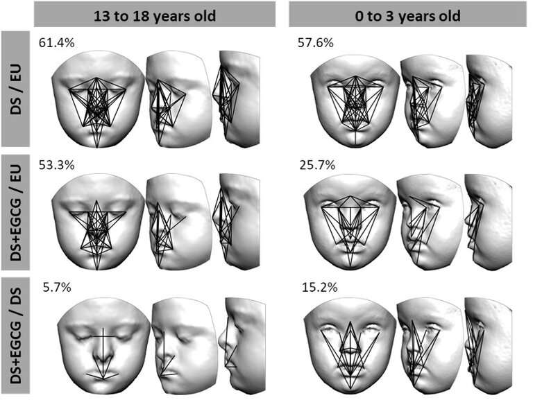 “All participants were photographed from various angles to create a 3-D model of their faces,” explains Neus Martínez-Abadías, professor at the University of Barcelona and co-lead author of the study. “We use 21 facial landmarks, and the distances between them, to compare the faces of the participants. In the youngest group between 0 and 3 years, we observed that 57 percent of the linear distances are significantly different when you compare the faces of children with Down syndrome that never received the treatment to those of children that do not have Down syndrome. For babies and toddlers who did receive EGCG treatment, this difference was much smaller, only 25 percent. After green tea supplementation, the facial dysmorphology decreases and the children with or without Down syndrome look more alike.”