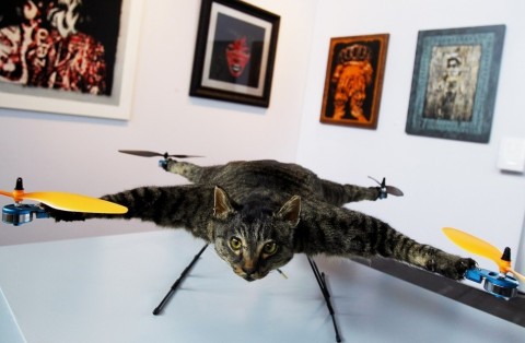 The kitty copter currently burning up the Internet is “half cat, half machine,” Jansen said in a SkyNews interview. Orville the deceased cat, himself named for aviation pioneer Orville Wright, was hit by a car, Jansen said. “After a period of mourning, he received his propellers posthumously.”