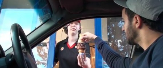 Cone-ing, as it appears in videos by its inventor Alki Stevens, usually consists of placing another cone on top of an ice cream cone handed by a fast food employee, and taping it for the Internet. However, he sometimes places a topping on the ice cream, or unexpectedly otherwise subverts the ice-cream-giving process, and then speeds off.