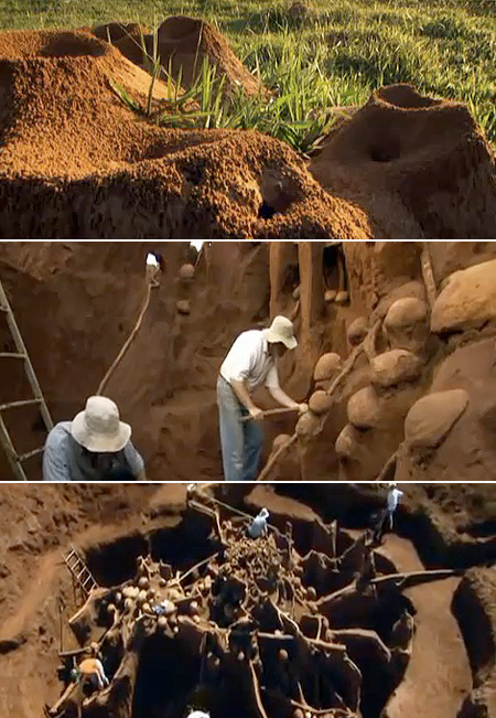As the plants grow, they form large, round hollow structures at their base called domatia that the ants live in instead of building nests. When the fruit appears, the ants eat the flesh and collect the seeds for future farming.