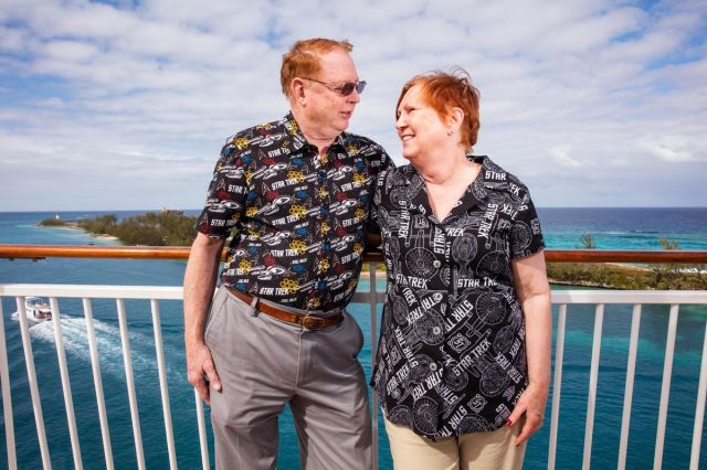 If the Pearl wasn’t quite a floating Enterprise—the crew didn’t wear Starfleet uniforms—there were constant references to “boldly going” and “warp speed.” The mood was friendly and accepting. “It’s nice to be among your people,” says Holmes of the Spocktopus. “You see a lot of cool costumes and a lot of people really, really geeking out.” Her parents were also on board, and she and her husband, Allen, 33, have already booked a penthouse for the first of two more Star Trek cruises that will take place next year, both hosted by George Takei, who played Sulu, the helmsman on Kirk’s Enterprise.