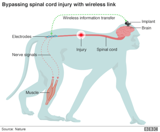 Rhesus monkeys were paralysed in one leg due to a damaged spinal cord. The team at the Swiss Federal Institute of Technology bypassed the injury by sending the instructions straight from the brain to the nerves controlling leg movement. Experts said the technology could be ready for human trials within a decade.