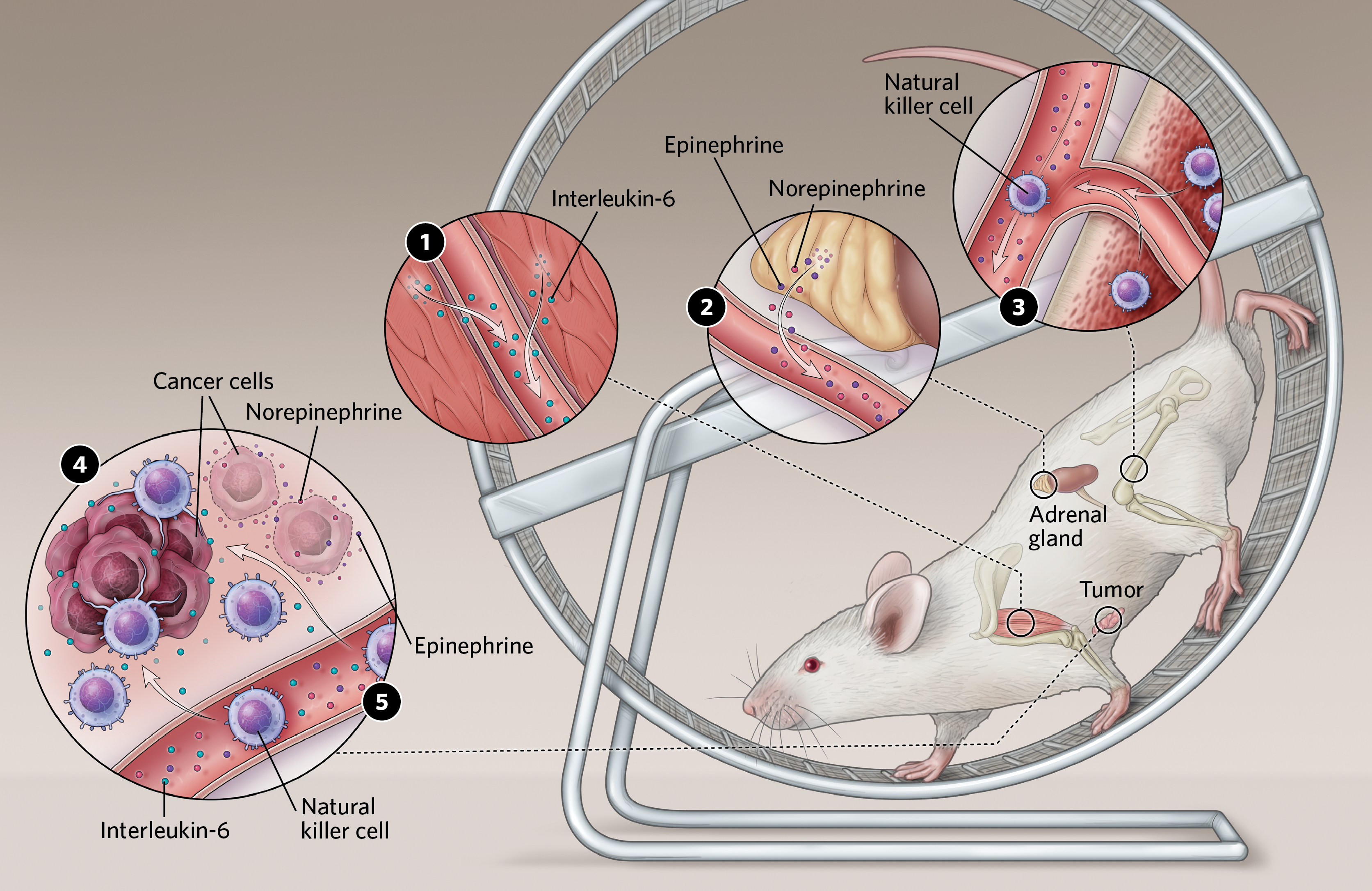 2) Exercise stimulates an increase in levels of the stress hormones epinephrine and norepinephrine, which can both act directly on tumors and stimulate immune cells to enter the bloodstream.
