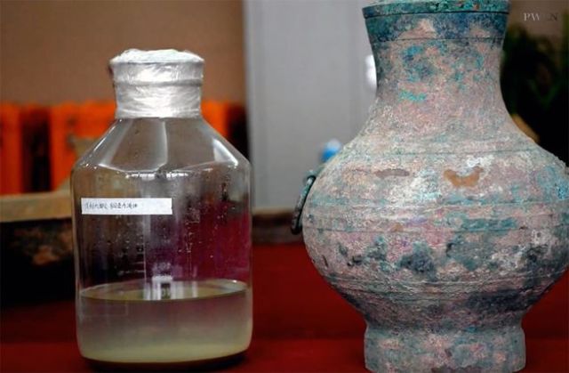 About 3.5 liters of the liquid was excavated from the tomb of a noble family in the city of Luoyang last October. It was initially judged by archaeologists to be liquor as it gave off an alcohol aroma.