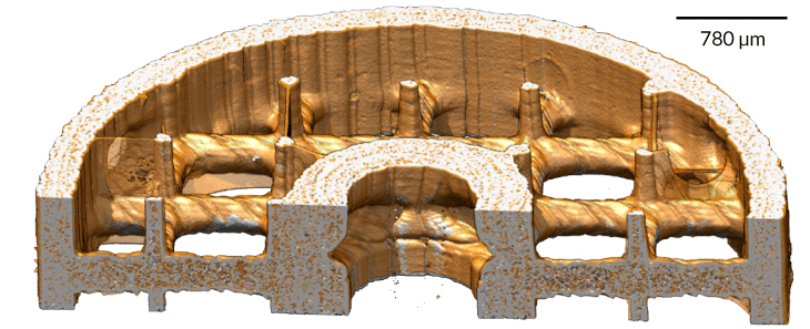 This image shows a cross-sectional view of a new 3-D printed cylindrical device that could cut down on toxic side effects from cancer treatment. Resin coatings (gold) bind to a chemo drug used to treat liver cancer, experiments show.