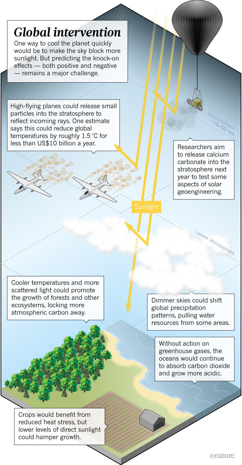 There are a lot of outstanding questions. Some researchers have suggested that solar geoengineering could alter precipitation patterns and even lead to more droughts in some regions. Others warn that one of the possible benefits of solar geoengineering — maintaining crop yields by protecting them from heat stress — might not come to pass. In a study published in August, researchers found that yields of maize (corn), soya, rice and wheat3 fell after two volcanic eruptions, Mount Pinatubo in 1991 and El Chichón in Mexico in 1982, dimmed the skies. Such reductions could be enough to cancel out any potential gains in the future.