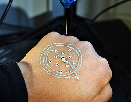 “The concept was to go beyond smart materials, to integrate them directly on to skin,” says Michael McAlpine, professor of mechanical engineering whose research group focuses on 3D printing functional materials and devices. “It is a biological merger with electronics. We wanted to push the limits of what a 3D printer can do.”