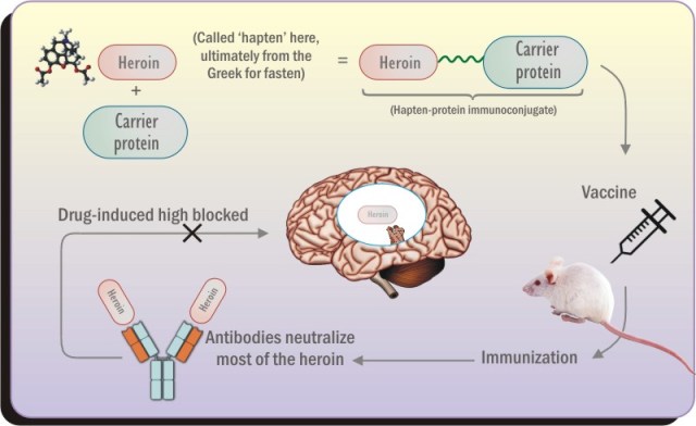 The heroin molecule does not naturally prompt an antibody response, so researchers attach it to a carrier protein that alerts the immune system to start making antibodies. Scientists also add an ingredient called an adjuvant to the vaccine, which boosts the immune response and makes the vaccine more effective.